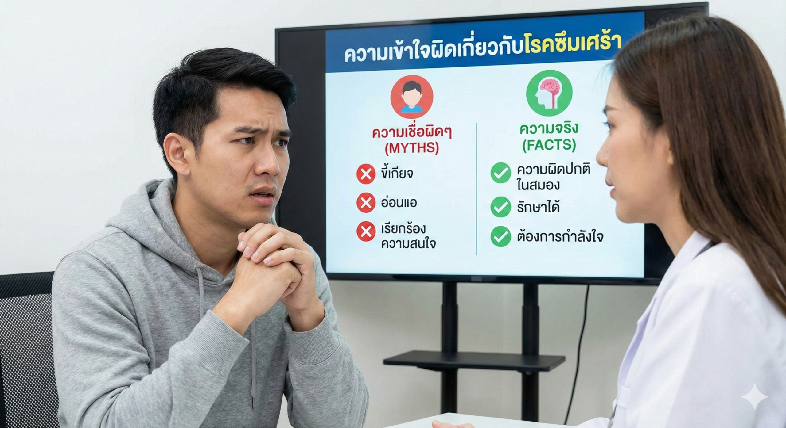 ✅ ความจริง: ผู้ป่วยหลายคนมีอาการ “Smiling Depression” (ซึมเศร้าเปื้อนยิ้ม) ภายนอกดูร่าเริงเพื่อกลบเกลื่อนความเจ็บปวด แต่ภายในใจพังทลาย การตัดสินคนจากภายนอกจึงอันตรายมาก