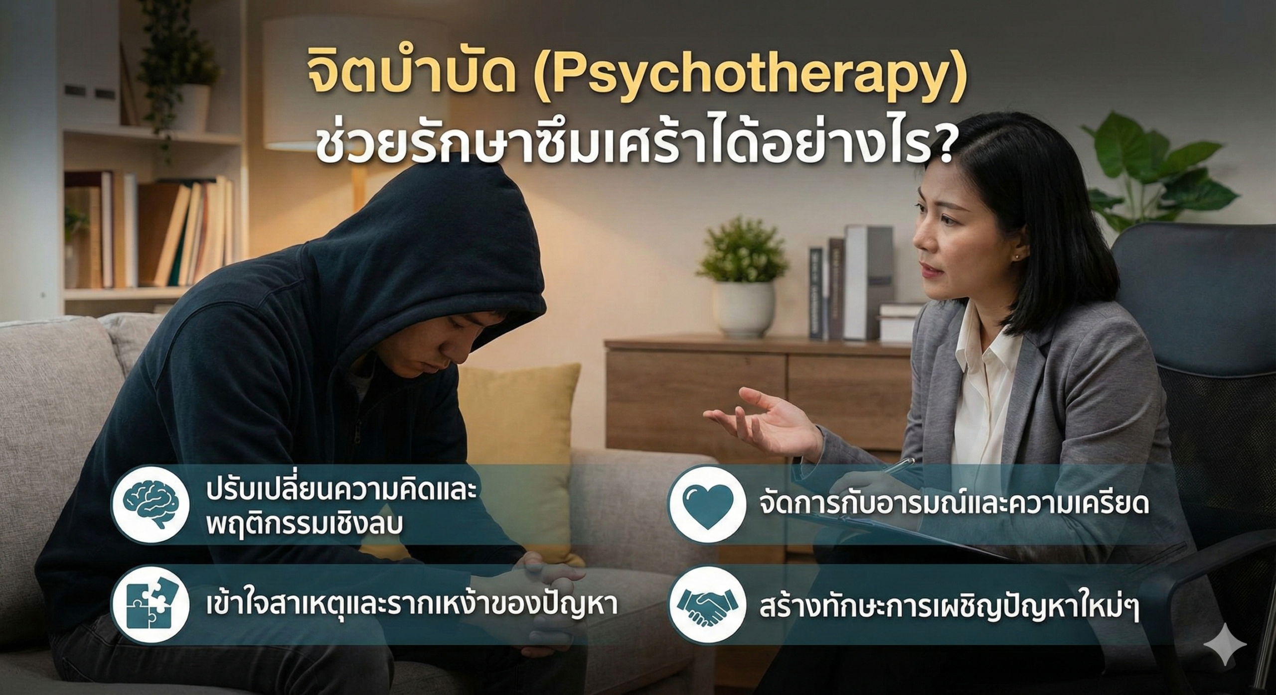 - จิตบำบัด: มอบ “อาวุธ” ทางความคิด ให้คุณรับมือกับปัญหาได้เอง ป้องกันไม่ให้กลับมาป่วยซ้ำในอนาคต