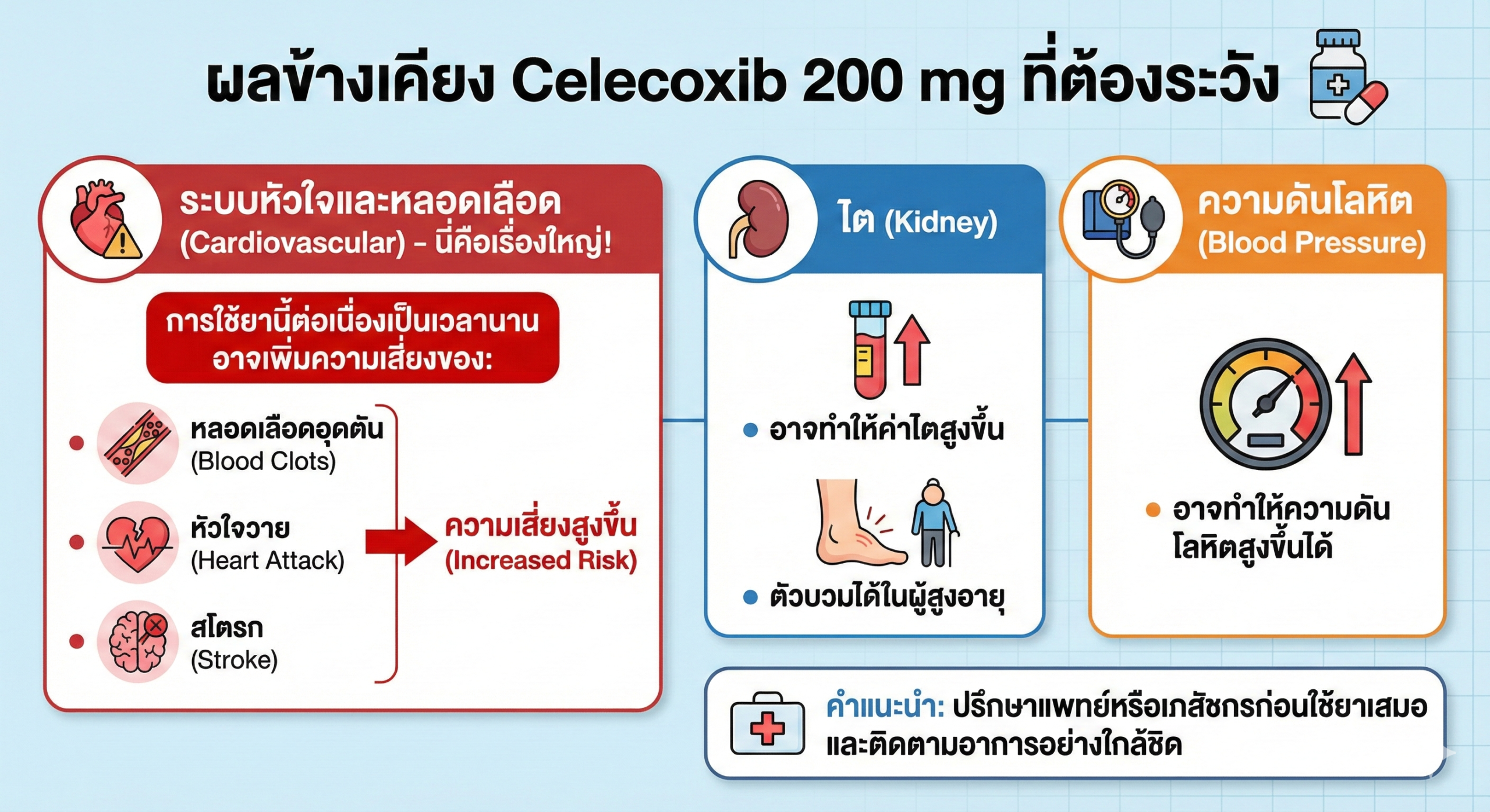 - ผลลัพธ์: อาการปวดและอักเสบหายไป โดยที่เกราะป้องกันกระเพาะอาหาร (COX-1) ยังคงอยู่ ทำให้ลดความเสี่ยงเรื่องเลือดออกในกระเพาะได้มาก