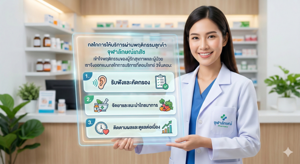 จุฬาลักษณ์เภสัช เข้าใจพฤติกรรมของผู้รักสุขภาพและผู้ป่วย เราจึงออกแบบกลไกการบริการที่ตอบโจทย์ 3 ขั้นตอน: