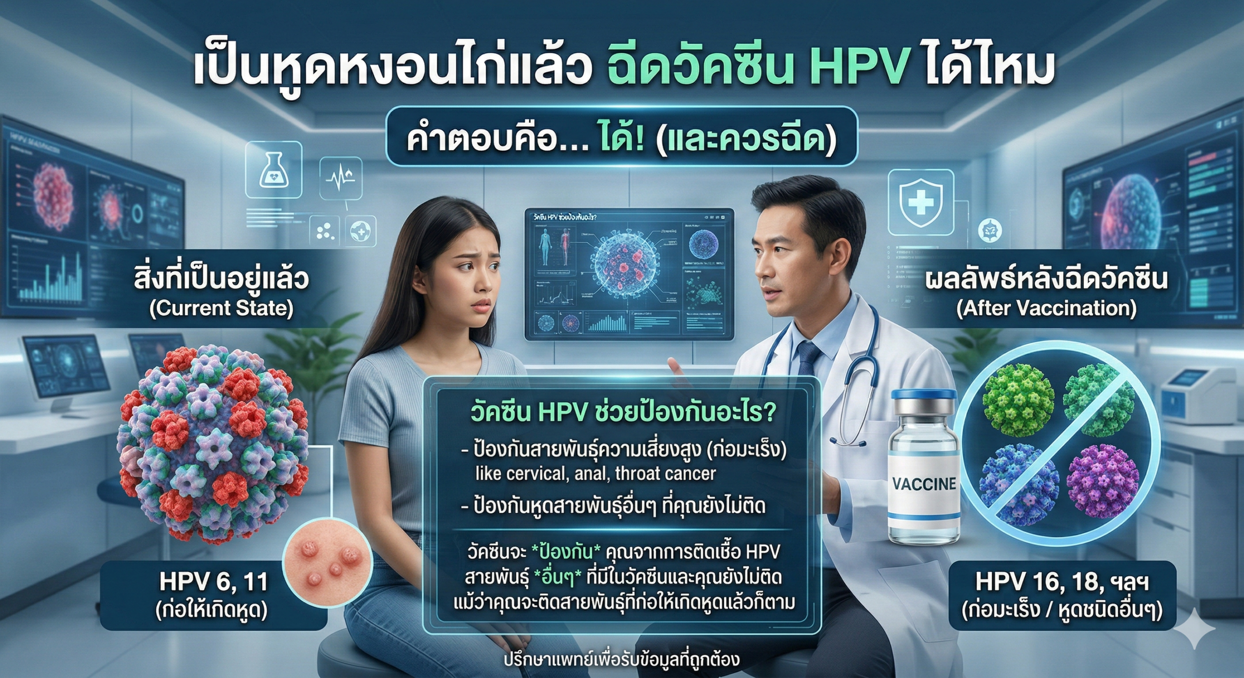 - สิ่งที่ช่วยและเป็นเหตุผลที่ต้องฉีด: เพื่อป้องกันเชื้อ HPV “สายพันธุ์อื่น” ที่คุณยังไม่เคยได้รับ โดยเฉพาะสายพันธุ์ดุร้าย (High-risk) เช่น สายพันธุ์ 16 และ 18 ซึ่งเป็นต้นเหตุของมะเร็งปากมดลูก มะเร็งทวารหนัก มะเร็งช่องปาก และมะเร็งองคชาต