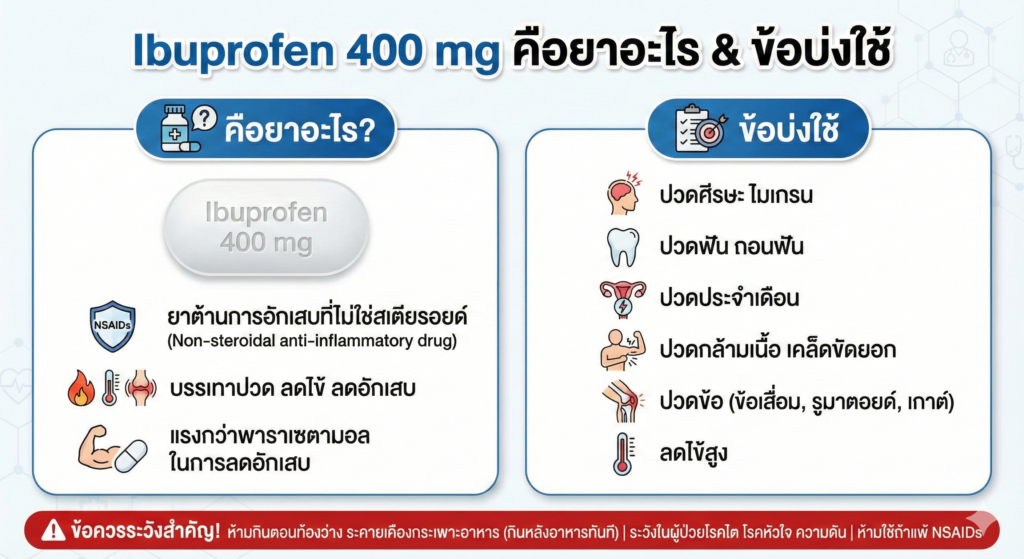 - ⚠️ ห้ามใช้ในผู้ที่สงสัยว่าเป็น “ไข้เลือดออก”: หากมีไข้สูงลอย ห้ามกิน Ibuprofen เด็ดขาด เพราะยานี้ทำให้เกล็ดเลือดทำงานผิดปกติ อาจทำให้เลือดออกภายในจนช็อกเสียชีวิตได้ (ให้ใช้พาราเซตามอลแทนจนกว่าจะแน่ใจ)