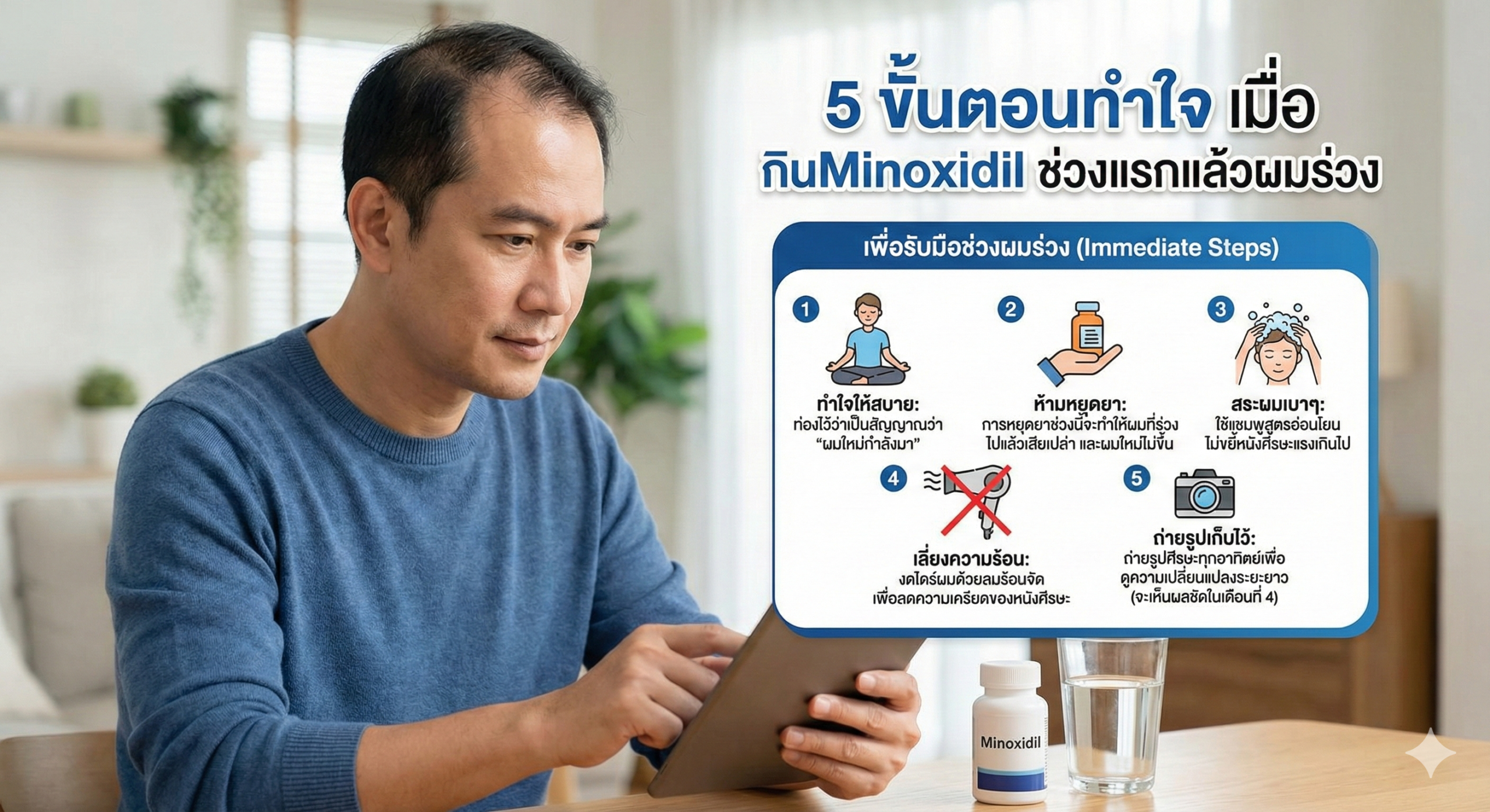 คุณไม่ต้องตกใจครับ อาการผมร่วงหนักในช่วงแรกเรียกว่า “การผลัดผม” (Shedding Phase) ซึ่งเป็น “สัญญาณที่ดี” ว่ายาเริ่มออกฤทธิ์แล้วครับ